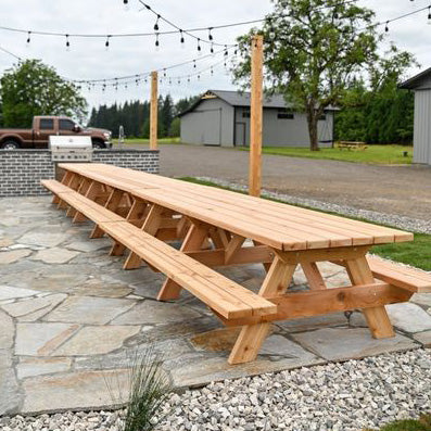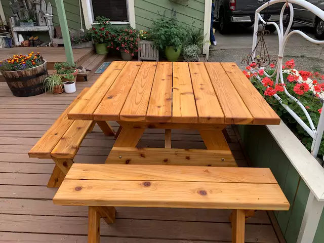 These outdoor picnic table are crafted from Cedar for it's durability against the weather and insects attacks.